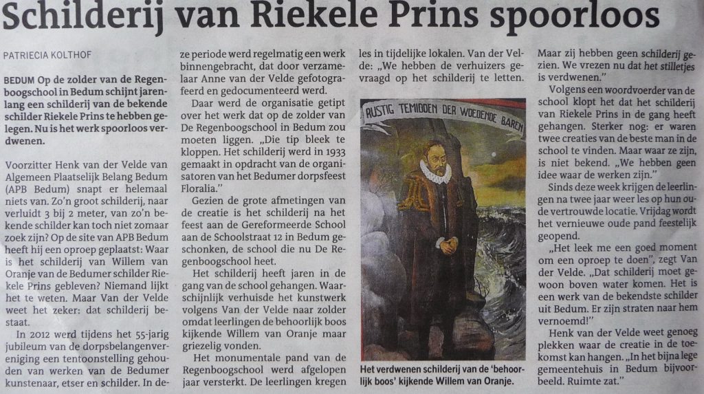 Voorzitter Henk van der Velde van Algemeen Plaatselijk Belang Bedum (APB Bedum) snapt er helemaal niets van. Zo’n groot schilderij, naar verluidt 3 bij 2 meter, van zo’n bekende schilder kan toch niet zomaar zoek zijn? Op de site van APB Bedum heeft hij een oproep geeplaatst: Waar is het schilderij van Willem van Oranje van de Bedumer schilder Riekele Prins gebleven?