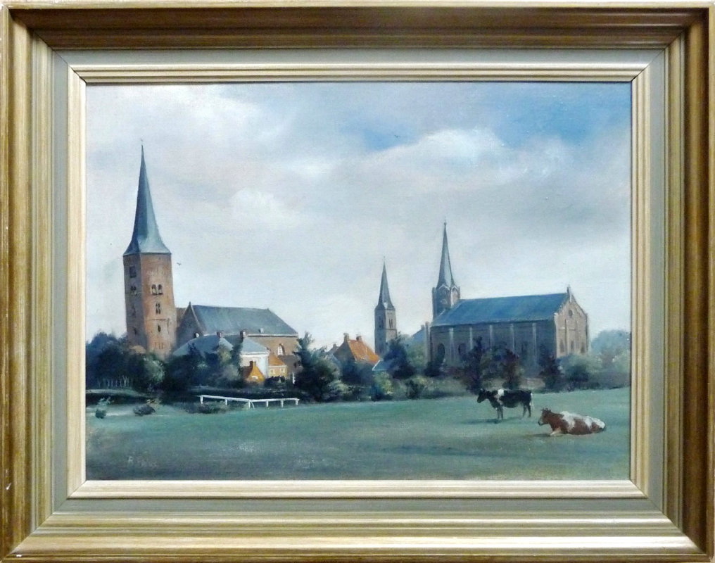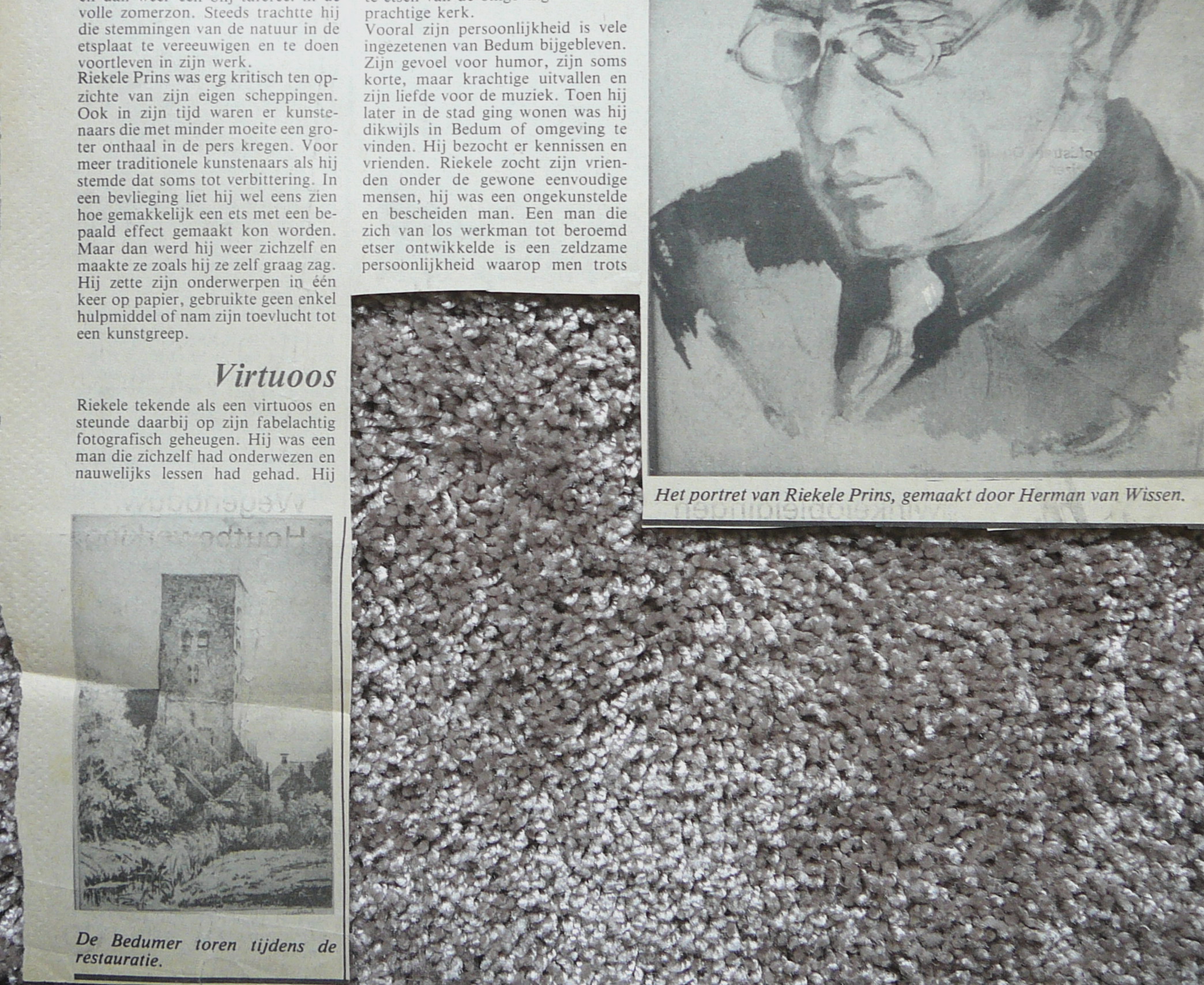 Het schilderij met een fraai dorpsbeeld van Bedum dook voor een paar weken geleden op bij de Rommelmarkt van Weerselo. Het was een onderdeel van een boedel van een nazaat van één van de eigenaren van de Tabaksfabrieken Heuping en Bloemen in Ootmarsum. De kinderen als erfgenamen hadden datgene uit de boedel meegenomen waar interesse in was en niets wetende van Bedum of van R. Prins ging het restant van de boedel dus naar de Weerselose markt voor een verdere verkoop. Een antiekhandelaar/verzamelaar zag wel de kwaliteit van het werk en ook wel de naam R.Prins er onder staan en kende ook wel de etsen Riekele Prins maar was niet zeker of het een echte “Riekele Prins” was. Thuiskomende ging deze man uit Enschede even Googelen en kwam al gauw op de site www.riekeleprins.nl terecht waar hij tot zijn stomme verbazing een foto van het schilderij zag. De eigenaar van de site bleek deze foto eens gekregen te hebben van een de Bedumer heer van Dis. Deze gepensioneerde boer inmiddels overleden had ook de “Riekele Prins-hobby” en had door de jaren heen heel veel informatie van de bekwame Bedumer schilder verzameld en hierbij veel mensen bezocht die werken van Riekele in het bezit hadden. Van Dis maakte dan systematisch hiervan een foto. Voor zijn dood is deze verzamelde informatie in handen gekomen van de eigenaar van de Riekele Prins site en is nu dus voor een ieder beschikbaar die daar interesse in heeft. Als een speer ging de handelaar van Enschede weer terug naar Weerselo waar gelukkig het schilderij nog steeds niet was verkocht. Voor een rommelmarktprijs werd het schilderij toen dus aangekocht. Thuis werd het schilderij door de handelaar aan de site eigenaar aangeboden en verkocht voor een bedrag naar waarde en is nu met een betere foto aan de site toegevoegd. De handelaar had met deze deal een “goede dag”! Natuurlijk was hem dat als “ontdekker” van het werk van harte gegund.
